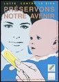 The faces of a mother and her baby with a hand holding a yellow condom packet and the message 'The fight against AIDS', 'protect your future' in French by CRAM, La Caisse Régionale d'assurance Maladie de Bourgogne franche-comté. Colour lithograph.