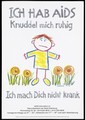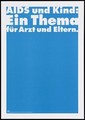 A blue background bearing the white lettering: "AIDS und Kind: Ein Thema für Arzt und Eltern" [AIDS and children: An issue for doctors and parents]; an advertisement by the FMH / BAG, Swiss Physicians and Swiss Federal Office of Public Health. Colour lithograph.