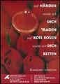 A red condom among red roses with German text: "With my hands I will support you, on red roses I will bed you. Condoms protect."; an advertisement for safe sex by the AIDS-Hilfe Aachen e.V. and AIDS counseling Aachen. Colour lithograph.