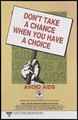 A hand clutching a banner inscribed 'Don't take a chance when you have a choice' with a backdrop inscribed repeatedly with the word 'AIDS'; an anti-AIDS advertisement for Sex Education Counselling Research Thearpy Training issued by the Family Planning Association of India. Colour lithograph, ca. 1996.