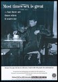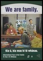 A man sitting at a table with a cup and saucer, another holding a skateboard, and another sitting on a sofa representing a gay family; advertisement for International Year of the Family by the Human Rights Commission in 1994. Colour lithograph by Matthew McKee.