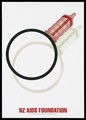 The male sign with a condom on the arrow representing an advertisement for the New Zealand AIDS Foundation. Colour lithograph by DMB&B NZ and Rob Poulton.