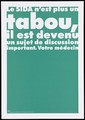 A dark green background bearing the white lettering: "Le SIDA n'est plus un tabou, il est devenu un sujet de discussion important. Votre médecin." [AIDS is no longer a taboo, it has become an important topic. Your doctor]; an advertisement by the Swiss Physicians [FMH] and Swiss Federal Office of Public Health [OFSP]. Colour lithograph.
