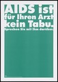 A green background bearing the white lettering: "AIDS ist für Ihren Arzt kein Tabu. Sprechen Sie mit ihm darüber." [AIDS is not a taboo subject for your. Talk to him about it]; an advertisement by the Swiss Physicians [FMH] and Swiss Federal Office of Public Health [BAG]. Colour lithograph.