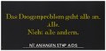 A message in German purple lettering that drug problems must not be ignored but dealt with; one of a series of posters from a 'Stop AIDS' campaign by the AIDS-Hilfe Schweiz in collaboration with the Office of Federal Health. Colour lithograph.