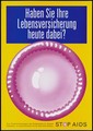 A large pink condom with a question in white lettering against a blue background asking 'have you got life-insurance today?'; German version of a series of 'Stop SIDA' [Stop AIDS] campaign posters by the Federal Office of Public Health, in collaboration with the der AIDS-Hilfe Schweiz. Colour lithograph.