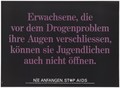 A warning in German purple about drug problems, AIDS and youths; one of a series of safe sex posters from a 'Stop AIDS' poster campaign by the AIDS-Hilfe Schweiz, in collaboration with the Office of Public Health. Colour lithograph.