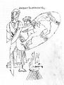 A surgeon applying a cautery iron to clearly defined points on a woman's lower abdomen (indicating the liver?). Pen drawing after a tenth century manuscript.