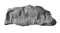 M0015285: Upper Palaeolithic horse and ox carved in low relief on rock shelter wall, La Roc, Charente, France