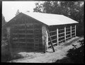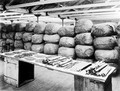 M0001556: Photograph of Cinchona bales and a table of South American bark samples in a warehouse