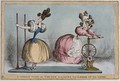 A woman is turning a wheel which is tightening the string around a girl's waist in order to make it smaller. Coloured etching by W. Heath, ca. 1830.