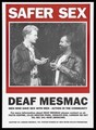 A white man and a black man sign the words Safer Sex in an advert from Deaf Mesmac. Colour lithograph.