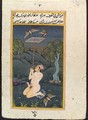 A man ejaculating, while holding a bird-trap on a bamboo pole to catch flying vaginas. Gouache painting by an Indian painter.