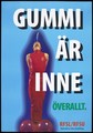 A man in red pvc standing vertically with his arms by his sides representing an ejaculating penis with two balloons as scrotums at his feet; surrounded in a purple silhouette in the shape of a condom against a blue background; with the message in Swedish, condoms are everywhere; a safe sex advertisement by the RFSL/RFSU and Malmöhus County Council. Colour lithograph, ca. 1996.