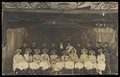 Actors sitting in front of an ambulance train, some in drag. Photograph, 191-.