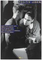Two gay men lean into each other as they stand at a bar with drinks with the message: "[HIV] positive living. Anyone can be [HIV] positive. Without knowing it. This means for everyone, protecting themselves and others. Even positive living"; an advertisement for safe sex by the Deutsche AIDS-Hilfe e.V. Colour lithograph by Jörg Reichardt and Detlev Pusch.
