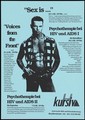 A man wearing a check sleeveless shirt open at the chest with his hands in his pockets representing an advertisement for a selection of documentary films about HIV and AIDS including a film entitled 'Voices from the Front" by the German actor/film producer and gay activist, Manfred Salzgeber; an event organised by Kursiv, Centre for AIDS and advice for gay men in Berlin. Photocopy, 1995.