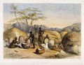 Men with spears walking past tree with figures sitting in the shade. Watercolour by E. Alec-Tweedie, c. 1920.