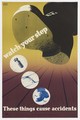 A booted foot about to tread on hazards (shown as vignettes): a loose bolt on the ground, defective floorboards, and untied laces). Colour lithograph after Arthur G. Mills.