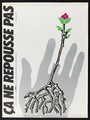 A hand with the middle finger cut off, contrasted with a flower growing in its place from the palm of the hand; advertising care in protecting the fingers. Colour lithograph after B. Chadebec.