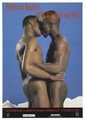 Two kissing naked black men; advertisement for safe sex by the Terrence Higgins Trust. Colour lithograph.