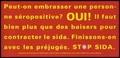 A message in French yellow lettering asking can you kiss an HIV positive person with the answer yes because you can't catch AIDS in this way; French version of a series of 'Stop SIDA' [Stop AIDS] campaign posters by the Federal Office of Public Health, in collaboration with the l'Aide Suisse contre le SIDA. Colour lithograph.
