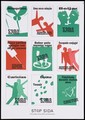 Nine green and red diagrams with Portuguese lettering showing how AIDS is not transmitted including top right, an insect [bite] to bottom right a heart [for faithfulness in marriage]; one of a series of six posters from the Stop AIDS campaign. Colour lithograph.