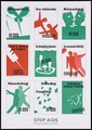 Nine green and red diagrams with English lettering showing how AIDS is not transmitted including top right, an insect [bite] to bottom right a heart [for faithfulness in marriage]; one of a series of six posters from the Stop AIDS campaign. Colour lithograph.
