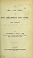 On the relative merit of the two operations for stone : Two lectures delivered at the Royal College of Surgeons of England, May, 1854 / by Frederic C. Skey.