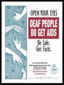 Five hands signing against a decorative background with a message for deaf people to open their eyes to AIDS; advertisement by the AIDS Education/Services for the Deaf. Colour lithograph.