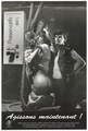 A man wearing a sailor's costume blows a condom up into a balloon with his trousers down next to another man wearing a leather waist coat and hat; a condom dispensing machine sits on the wall to the left; with the message: "Act now!"; an advertisement for World AIDS Day, 1 December 1993 by ARIS (Association of gays and lesbians in Lyon). Lithograph by Félix [?].