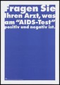 A blue background bearing the white lettering: "Fragen Sie ihren Arzt, was am "AIDS-Test" positiv und negativ ist" [Ask your doctor what the "AIDS test" positive and negative is]; an advertisement by the Swiss Physicians [FMH] and Swiss Federal Office of Public Health [BAG]. Colour lithograph.