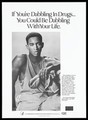 A young black man in a tracksuit holding a towel representing the risks involved in dabbling with drugs; advertisement about AIDS by the U.S. Department of Health and Human Services. Lithograph, 1993.