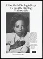A black woman holding a mug representing a woman whose partner has AIDS through sharing needles; an advertisement about the risk of AIDS by the U.S. Department of Health and Human Services. Lithograph, 1993.