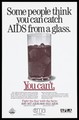 A glass with a warning that you can't catch AIDS from sharing a drink; advertisement for AIDS information lines by the California Medical Association. Colour lithograph.