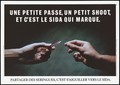 A hand offers a syringe to another hand with a warning about transmission of AIDS through needle-sharing. Colour lithograph, 1988, for the Coordination Committee on Alcohol and Other Drugs (French Community in Belgium).