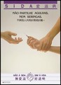 A hand offering a syringe to another is stopped by a third hand representing a warning about the dangers of sharing needles and contracting AIDS. Colour lithograph for the Unidade Educaçāo para a Saúde, Macau, ca. 1995.