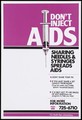 A syringe forming the 'i' of the word 'AIDS'; a warning about the dangers of spreading AIDS through sharing needles and syringes. Colour lithograph, ca. 1990's (?).
