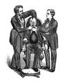 A man breathing in nitrous oxide (laughing gas) and a man exhibiting its exhilarating effects. Wood engraving, c. 1840.
