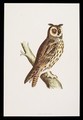 An owl with a bird clutched in its talons is disturbed by a dog. Wood engraving.