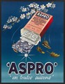 Cherry blossom and falling leaves, representing spring and autumn respectively, with box of Aspro pills for use in those seasons. Colour lithograph, 1957.