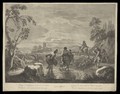 Evening: shepherds, labourers on their way home after a day of work, followed by two women and a child who cross a stream. Etching by J. Wagner after G. Zocchi.