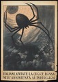 A giant spider catching crowds of humans in its web; representing tuberculosis. Colour lithograph by B. Cascella, ca. 1920.