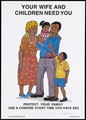 A man and wife with their two children representing a safe-sex and AIDS prevention advertisement by the NGO AIDS Consortium with PATH in Kenya. Colour lithograph, ca. 1997.