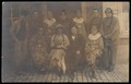 British soldiers in France, one in drag, pose for a group portrait. Photographic postcard, 191-.