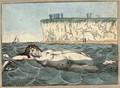 Margate, Kent: a woman swimming in the sea; in the background people are looking out to sea from cliffs and a beach. Coloured etching, ca. 1800.