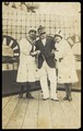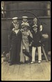 Three sailors, two in drag wearing pierrette costumes, pose on deck. Photographic postcard, 191-.
