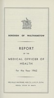 - [Report of the Medical Officer of Health for Walthamstow].Walthamstow (England). Borough Council.Date: [1962?]