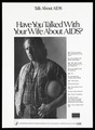 A man in a check shirt and gilet holding a hard hat under his arm looks looks directly out at the viewer with an interview about talking of AIDS with his wife; advertisement by the U.S. Department of Health and Human Services. Lithograph, 1991.