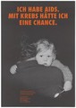 A child holding a spoon leaning on the shoulders of his father with the message in German: "I have AIDS. With cancer I would have a chance"; an advertisement by the AIDS-Forum Berlin e.V [part of the Deutsche AIDS-Hilfe e.V.]. Colour lithograph.